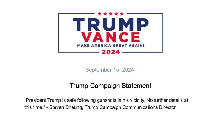 “El presidente Trump se encuentra a salvo tras los disparos que se produjeron en sus inmediaciones. No hay más detalles por el momento”, apuntó en un escueto texto distribuido a la prensa Steven Cheung, director de comunicaciones de la campaña.