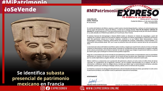 La secretaria de Cultura de México, Claudia Curiel de Icaza, exigió ayer frenar una subasta en París, Francia, luego de que autoridades identificaran cuatro piezas arqueológicas prehispánicas, que forman parte del patrimonio mexicano, en el catálogo de las piezas subastadas.
