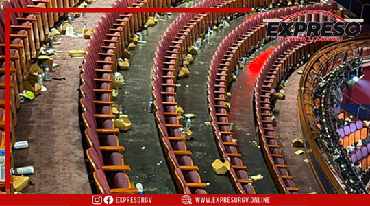 En la fotografía se observan los pasillos y asientos del recinto cubiertos de basura, entre la que destacan: